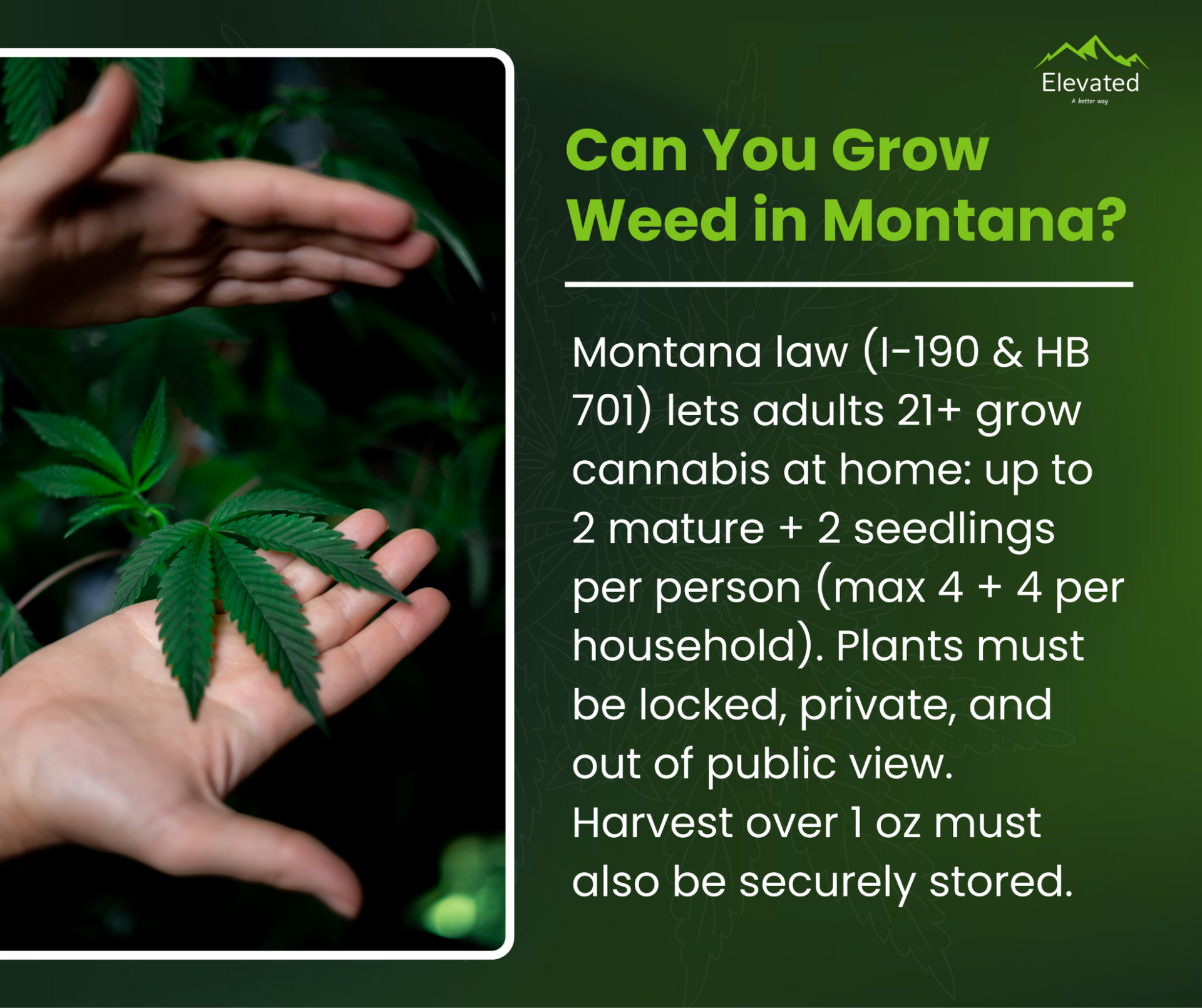 This article is for educational purposes only and does not constitute legal advice. Cannabis laws are subject to change at the state, county, and local level. Elevated recommends consulting Montana state resources or legal counsel for the most current regulations. Always consume responsibly and in compliance with the law.
