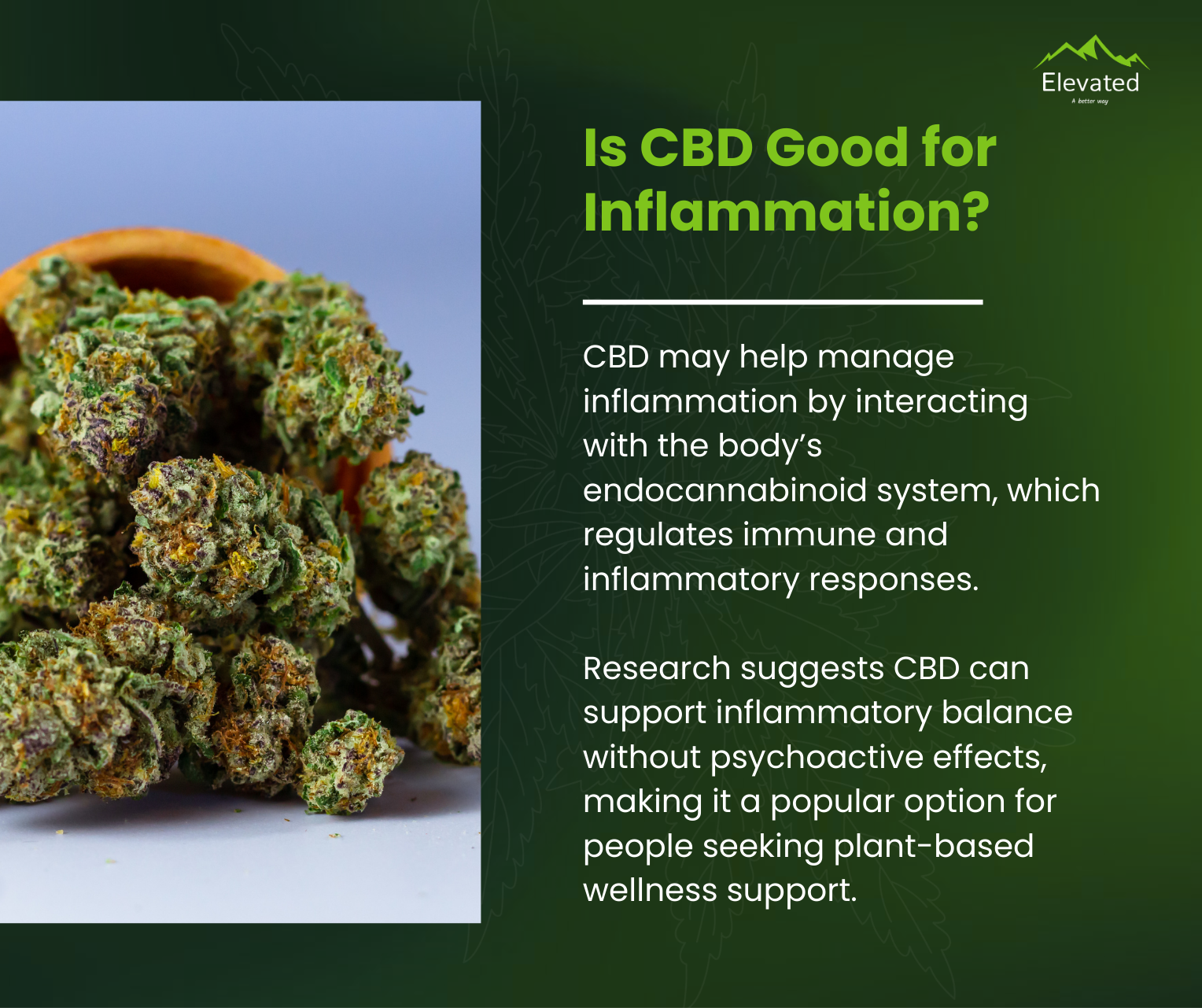 CBD may help manage inflammation by interacting with the body’s endocannabinoid system, which regulates immune and inflammatory responses. Research suggests CBD can support inflammatory balance without psychoactive effects, making it a popular option for people seeking plant-based wellness support.