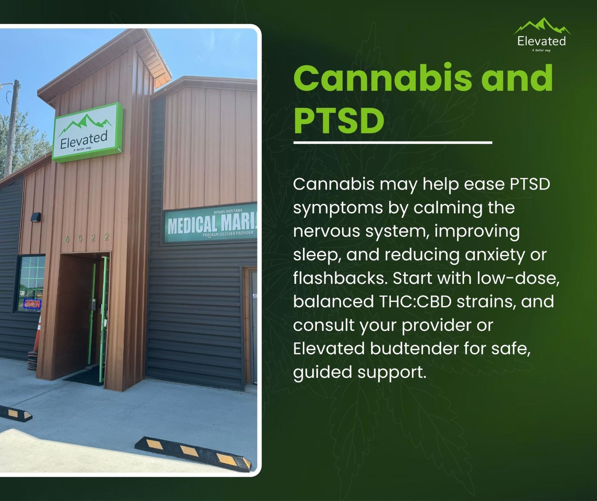 If cannabis is something you are considering as part of a broader support plan, stopping by your nearest Elevated Montana dispensary can be a helpful first step. Our budtenders are there to listen, answer questions, and help you navigate options with care and clarity, without pressure or assumptions.
